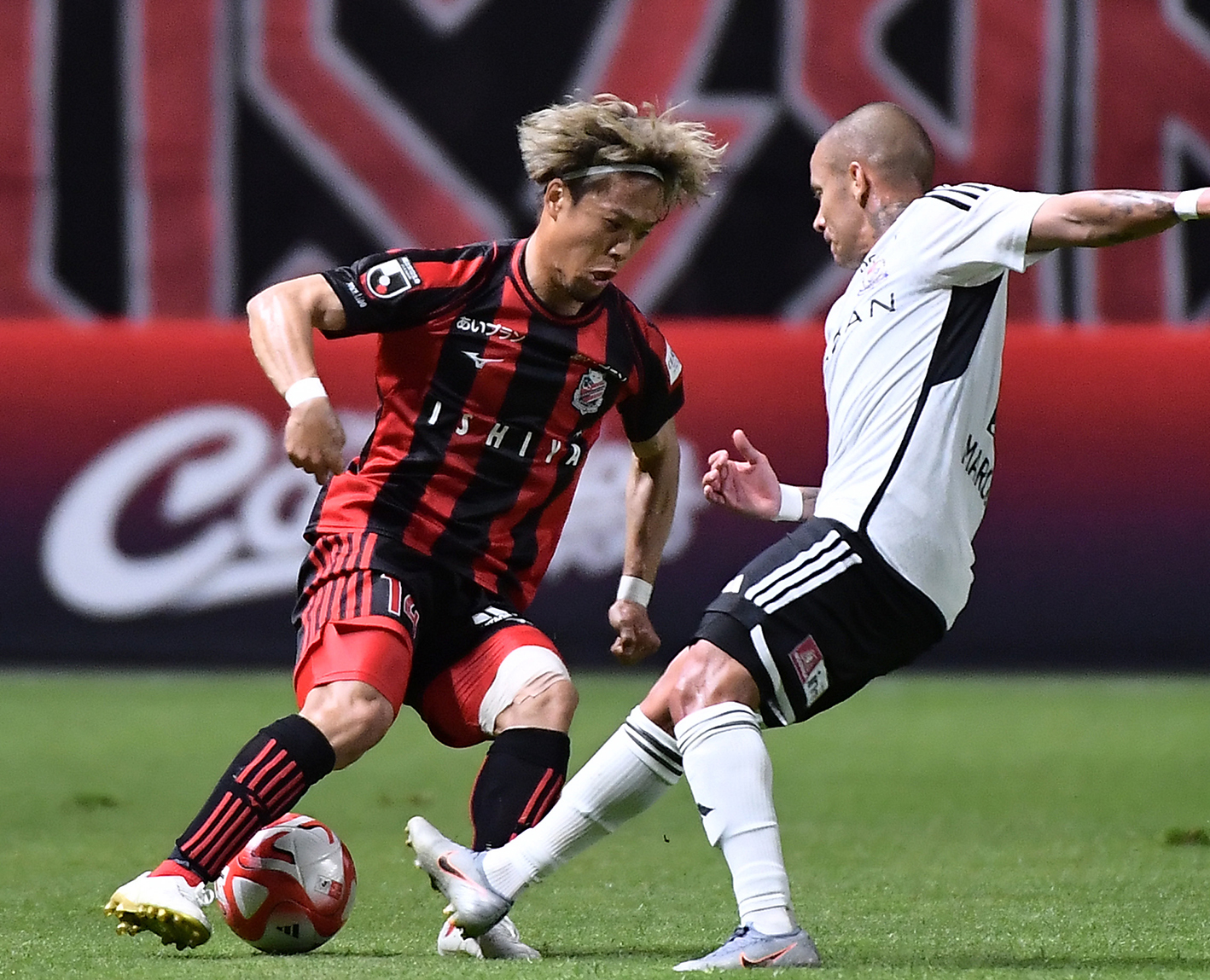 前半、MFマルコスジュニオール(右)と競り合うMF駒井