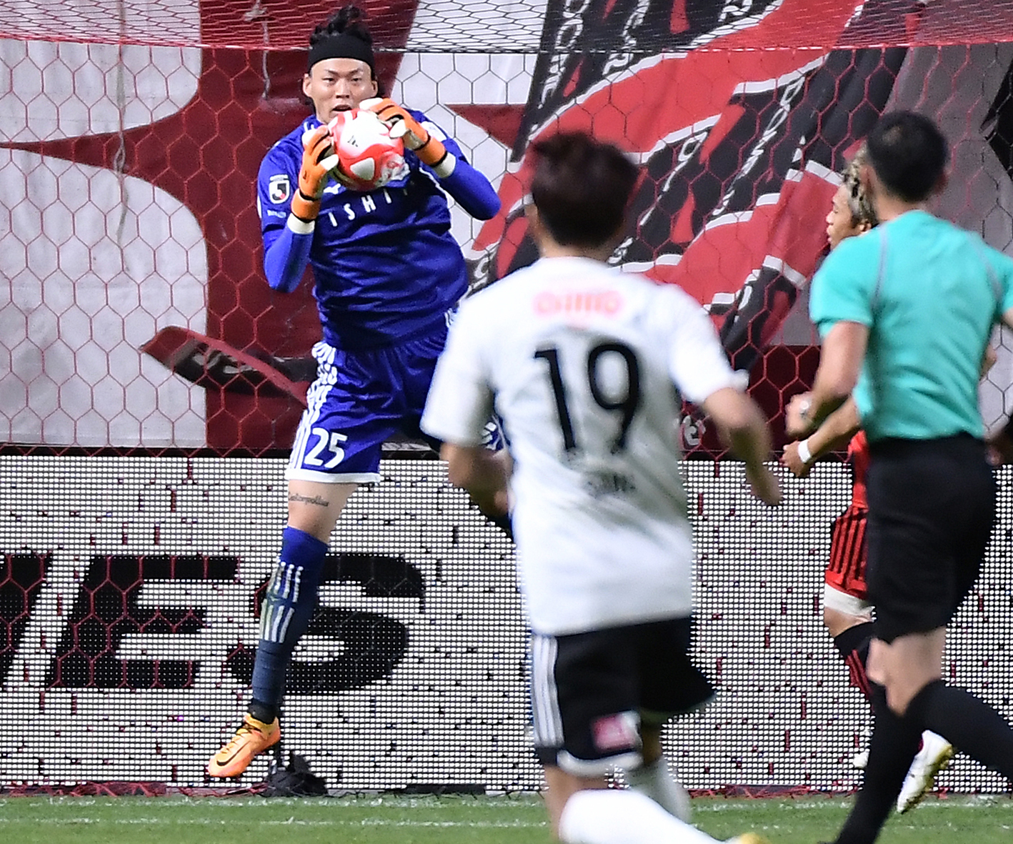 前半、ミドルシュートをキャッチするGK具聖潤(左)