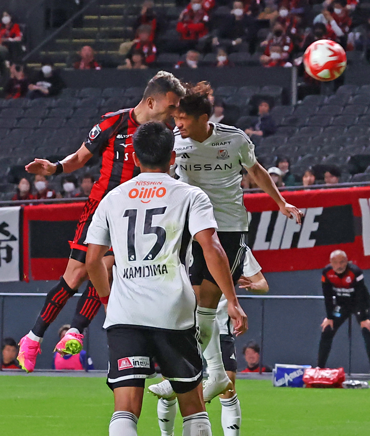 後半12分、MFルーカス(左)がヘディングシュートを決めて同点に追いつく