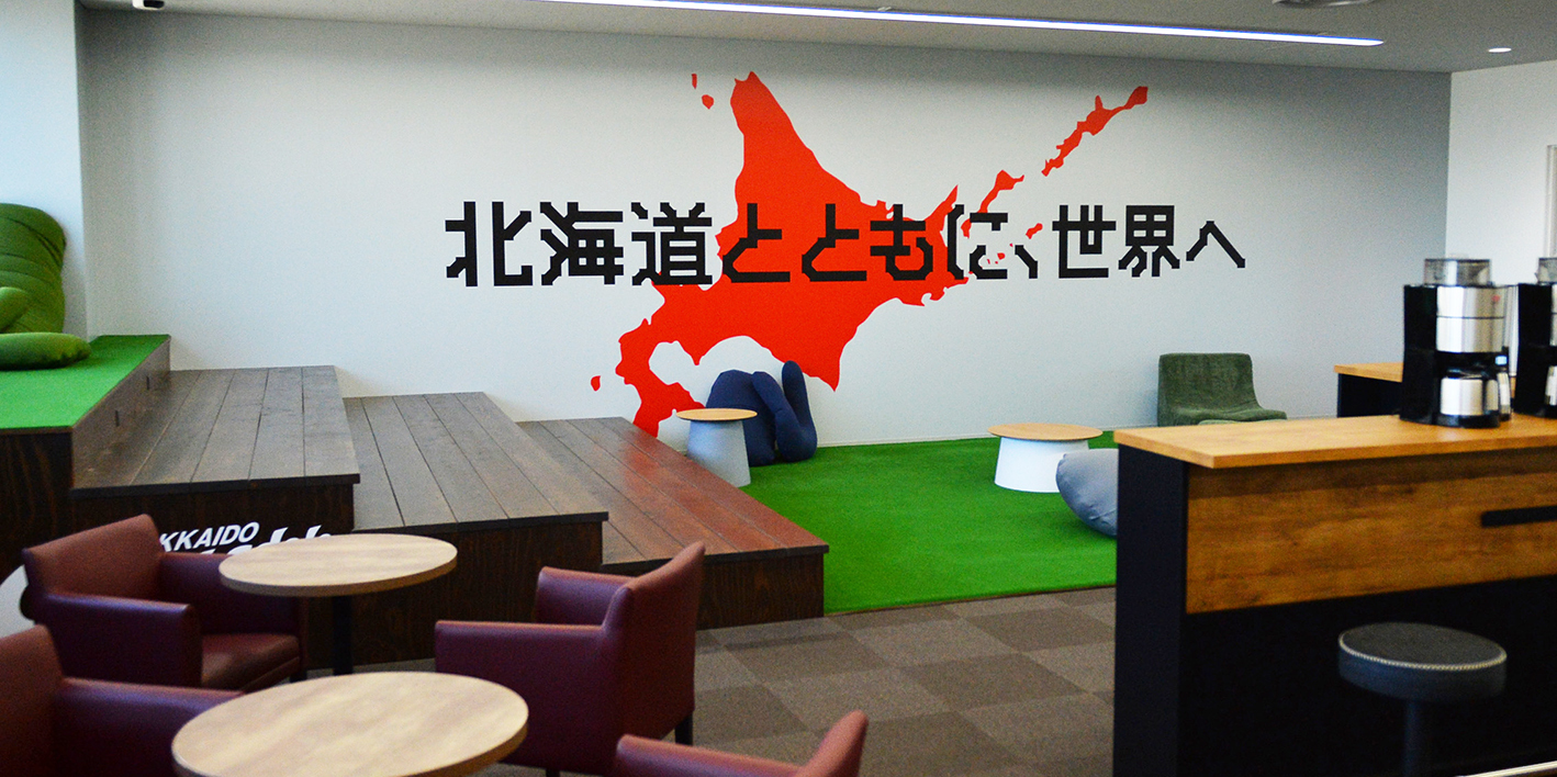 2階にある就業スペースの壁にクラブスローガン「北海道とともに、世界へ」のロゴを大きく掲出。階段の壁は赤を基調とし壁面にはクラブの歴史年表や過去の名シーンのグラフィックが描かれている。1階に3カ所、2階に2カ所設置されたミーティングルームには、クラブ創設年の「1996」や北海道の市町村数「179」、クラブに多大な功績を残した故・石水勲最高顧問の名前に由来する「130」、サポーターナンバーの「012」、エンブレムやドーレくんのモチーフとなっているシマフクロウをもじった「296」など、チームと関わりのある部屋番号を配し随所にクラブの誇りが感じられる。