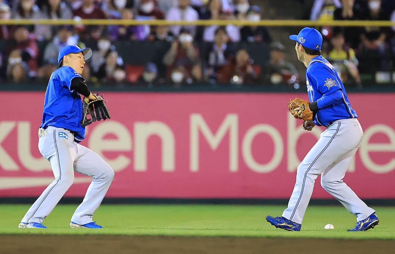 八回無死、フランコの打球を捕球し損なう矢沢(左)と上川畑