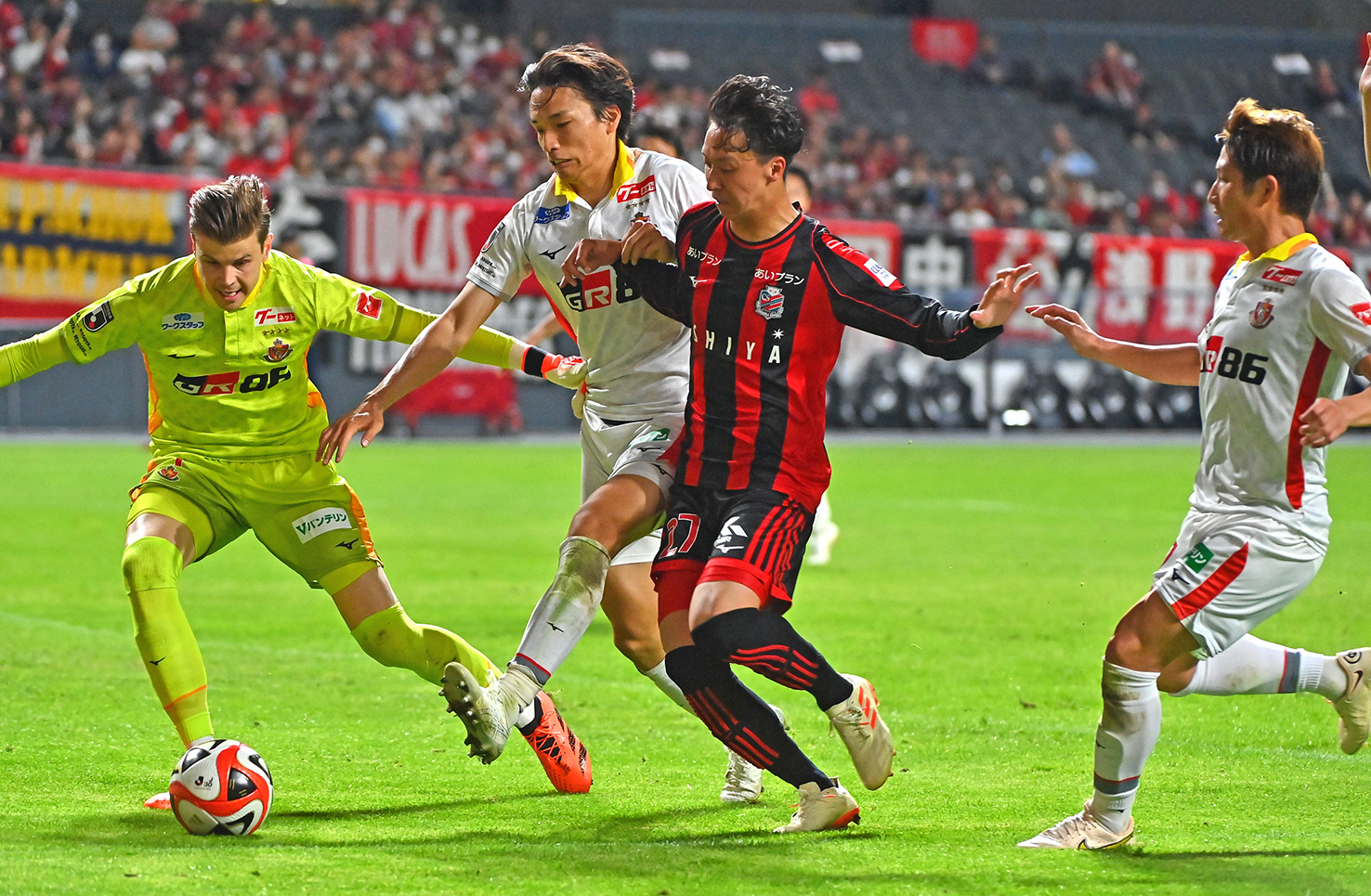 後半、相手ゴールに攻め込むも止められるMF荒野