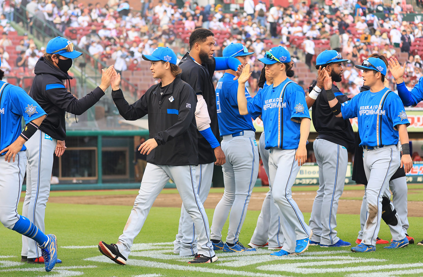 勝利のハイタッチをする鈴木(左から3人目)と新庄監督ら選手たち