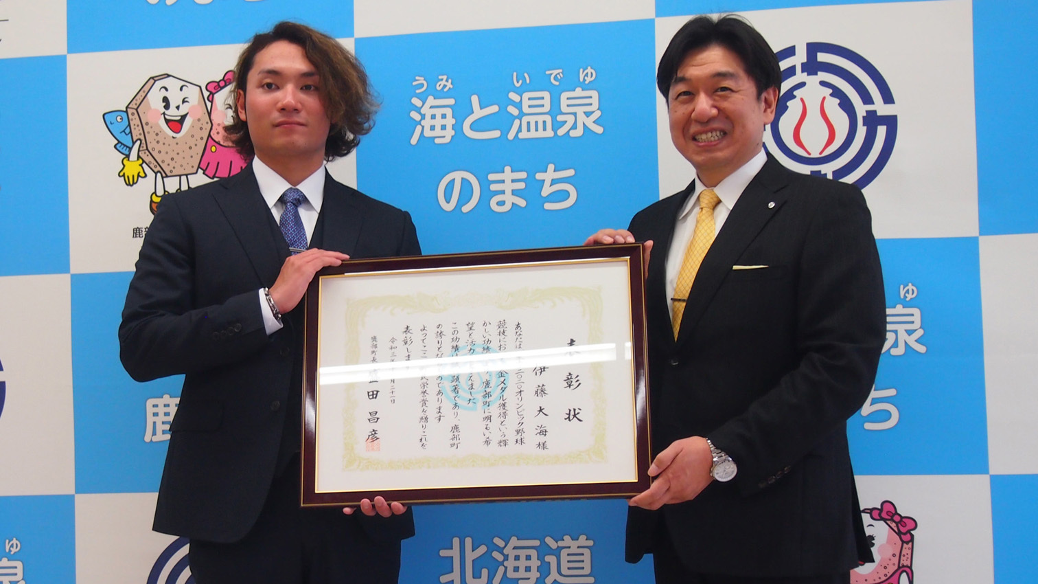 2021/12/17 15:50ファイターズ鹿部町役場にゴールドポスト!大海の五輪での功績称え設置